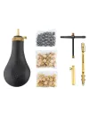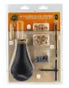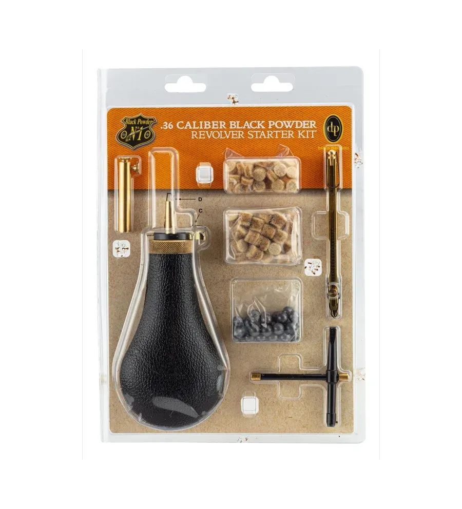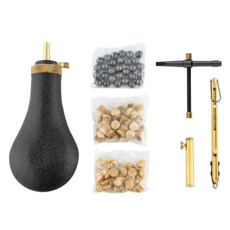 Set de chargement complet pour les revolvers à poudre noire en calibre .36, qui comprend : 1 poire à poudre noire cal 36 1 clef à cheminées 1 distributeur d'amorces 25 balles rondes sphériques 25 bourres feutre