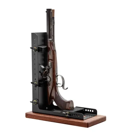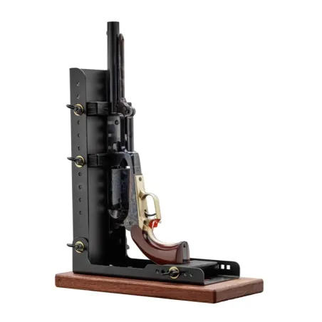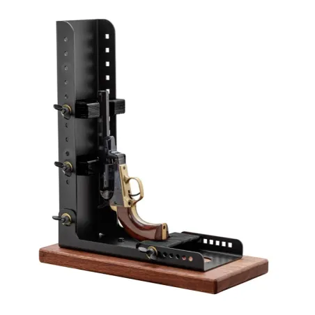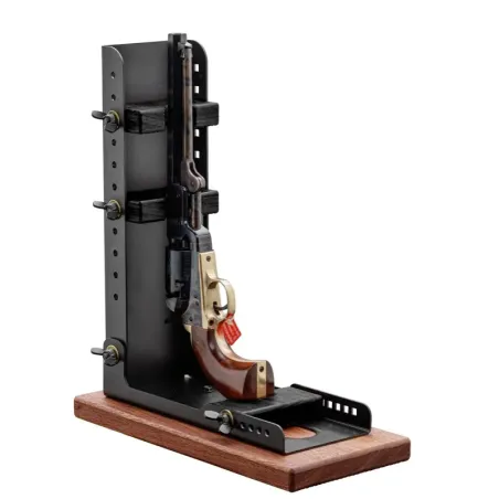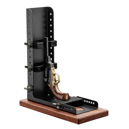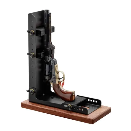 Ce support de chargement est compatible pour tous les types d'armes de poing (Revolver, pistolet silex, pistolet à mèche, pistolet percussion...). Il conviendra aussi bien pour le rechargement que pour le nettoyage de vos armes. Il fera également un support idéal pour exposer votre arme dans une vitrine.  Convient aux revolvers calibres .36 et .44 et aux pistolets de tous calibres quelle que soit la longueur du canon. Ce support dispose, en effet, de cales réglables en hauteur permettant de l'ajuster par rapport à la hauteur totale de l'arme. Base support en bois Jatoba couleur chêne (bois sud-américain reconnu pour sa dureté élevée) Base rainurée avec texture anti-dérapante pour assurer une meilleure stabilité du support Bloc de support de rechargement amovible avec ouverture jusqu'à 90° Cale en bois réglable pour la pose et le maintien de la crosse Cales en bois réglable pour la pose et le maintien du canon