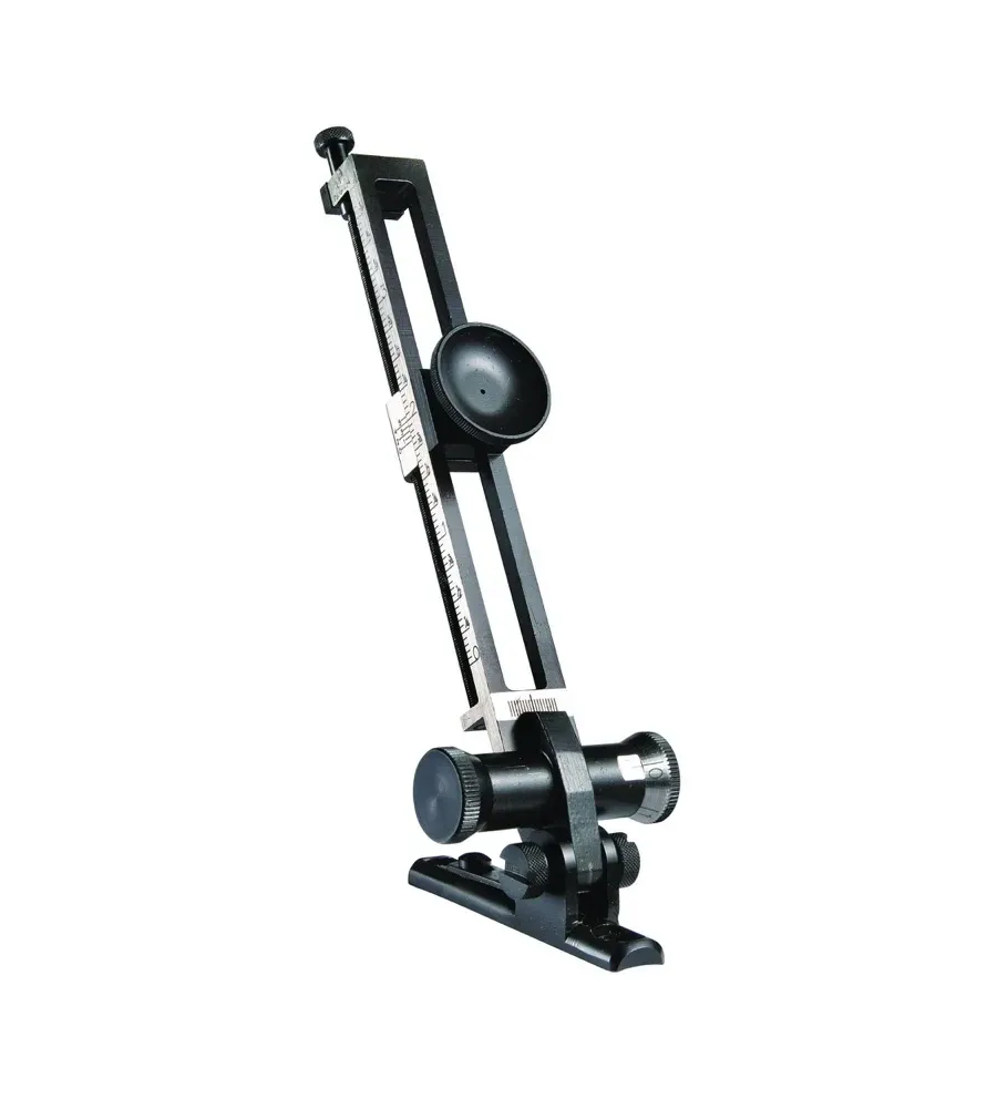 Dioptre de haute précision avec réglage en hauteur sur l’oculaire, par vis micrométrique. Un tour complet de la vis horizontal, soit à droite ou à gauche, déplace le point visé par 2,5 minutes d’angle (réglage possible en demi minute).