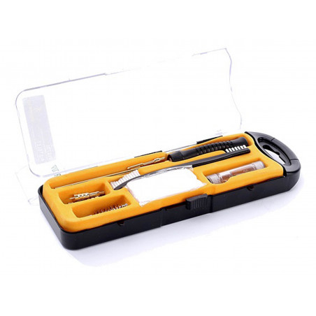 Le kit de nettoyage Browning intgre :1 baguette de nettoyage en Laiton poigne en polymre3 brosses en bronze phosphoreux3 ttes de tire-chiffon crant en Laiton2 embouts fente en Laiton1 brosse de nettoyage deux ttes en nylon40 chiffons de nettoyage non tisse1 flacon vide deux compartiments pour huile et graisse