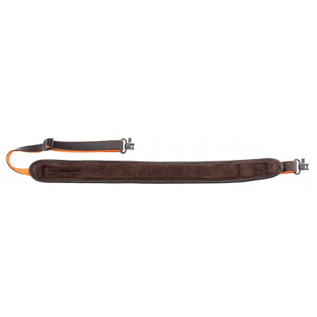 Bretelle avec fixation automatique sur grenadières, dessus cuir pleine fleur et dessous anti-dérapant. Réglable en longueur. Emplacement pour 2 munitions métalliques.