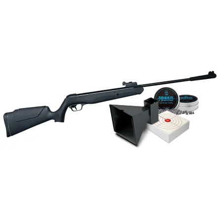 PACK contenant : - 1 Carabine LB600 Armement Canon basculant Calibre 4.5 Crosse synthétique Hausse réglable Guidon tunnel fibre optique Sûreté manuelle Puissance 10 joules Longueur 108,5 cm Longueur canon 48 cm Poids 2.9 kg - 1 boite de plombs - 1 paquet de 100 cibles 14x14 - 1 porte cible en métal