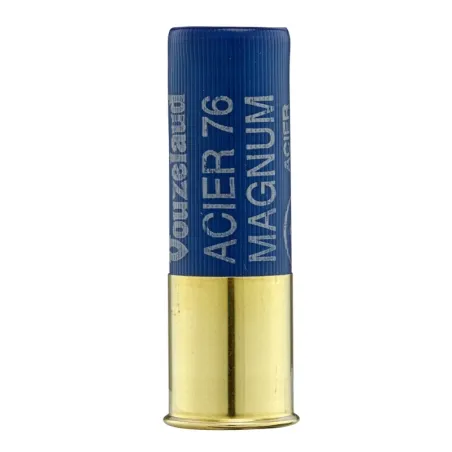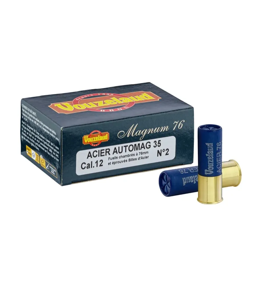 Cartouches Vouzelaud destinées à la sauvagine en zone humide. Cartouche sans plomb exclusivement développée pour l'utilisation dans des fusils lourds ou semi-automatiques chambrés à 76 ou 89 mm et éprouvés billes d'acier.Avec 35 grammes d'acier zingué en calibre 12 qui sont propulsés à la vitesse de 430 m/s, elle donnera la plus grande efficacité pour ces armes. Chokage maxi : 1/2 choke
