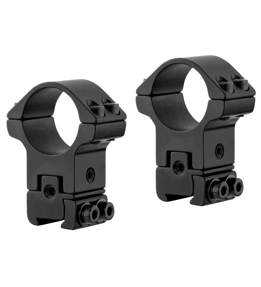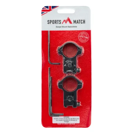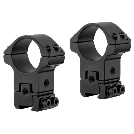 Colliers pour carabine de loisir à plomb et carabine 22 Long Rifle Pour corps de lunette de 1'' (25.4 mm) Adaptable pour les rails de 9.5 mm à 11.5 mm Usiné en alliage d'aluminium haute qualité Système de réglage par vis en dérive et en élévation de 0 à 50 MoA. Profil haut pour des lunettes avec un objectif de 60 mm maximum. Verrouillage du corps de la lunette au moyen de quatre vis 6 pans Fabriqué en Grande-Bretagne