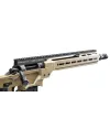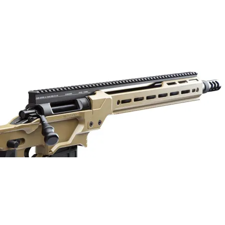 La base Picatinny étendue, offrant 20 MOA / 5,8 MRAD d'élévation pour le fusil à verrou DELTA 5 PRO, étend la longueur du rail Picatinny 1913 Mil-STD disponible sur le dessus jusqu'à l'extrémité du garde-main pour un espace complet de 19,7" d'espace continu pour le rail. La conception monobloc permet l'utilisation d'optiques montées à l'avant telles que la vision nocturne et thermique.