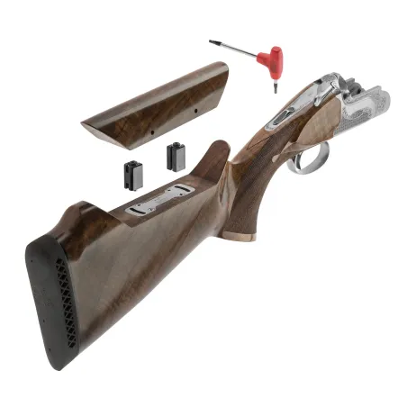 Bande haute réglable. Plaque de couche en caoutchouc. Livré avec 8 chokes externes longs. La bascule plus large offre une surface de contact plus importante avec la structure métallique du garde main, augmentant la résistance tout en réduisant les frottements.