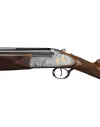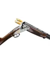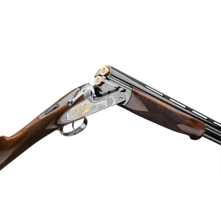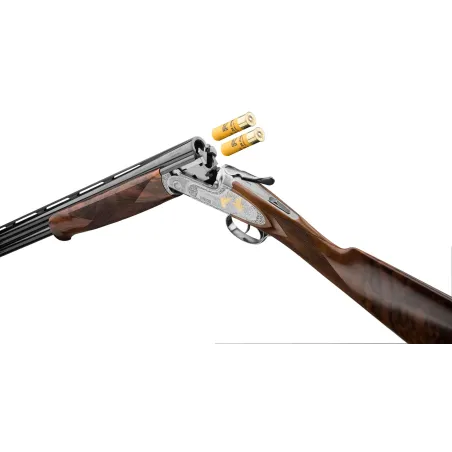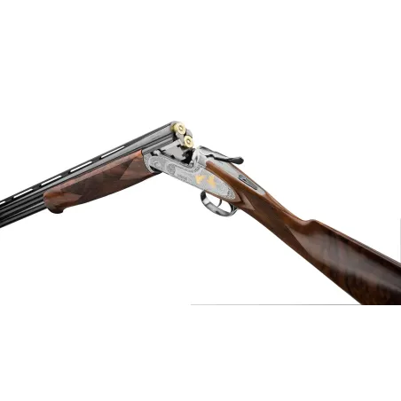 Le fusil est conçu avec un faux corps en Ergal, un alliage d'aluminium et de zinc, qui lui confère légèreté et robustesse. Il est doté d'une chambre de calibre 20, idéale pour la chasse au petit gibier. La crosse et le devant sont en noyer sélectionné, avec une finition huilée qui met en valeur la beauté naturelle du bois.