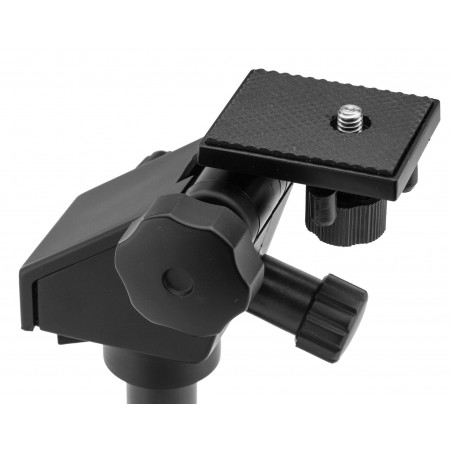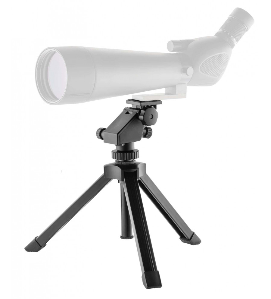 Trépied pliant avec vis au pas standard 1/4 ''.Avec 2 molettes supplémentaires pour un réglage fin en latéral et vertical pour centrer précisément la lunette.Longueur plié : 34 cmHauteur de la platine en position d'utilisation : 28 cm à 37,5 cm