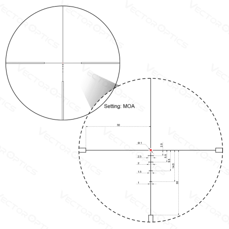 Spécificités: Grossissement: 1-6x Diamètre de l'objectif: 24mm Diamètre de la lentille oculaire: 35mm Pupille de sortie: 10.5-3.9mm Traitement de l'optique: Multi-traitement complet Champ de vision à 100 yards: 116.6-19.2 pieds Relief oculaire: 96-95mm Valeur du clic: 1/2MOA Plage d'élévation: 60MOA Plage de réglage: 60MOA Réglage de la parallaxe: 100 yards Réticule: VTC-3 Gravé Réticule BDC: Point central à 200 yards, le repère suivant se réfère à 300, 400, 500 et 600 yards. Compensation dioptrique à partir de l'oculaire à mise au point rapide (+2 à -2) Illumination: 6 niveaux d'intensité de rouge Longueur d ela partie centrale de la tourelle: 38mm Distance entre la partie centrale de la tourelle et la bague d'alimentation: 59mm Fonction de remise à zéro du réglage: tirer vers le haut pour libérer la rotation Résistance aux chocs testée à 750g - Résistant à l'eau Entièrement purgée à l'azote pour éviter toute formation de buée sur les lentilles Aluminium de qualité aéronautique 6061 T6 finition noir mat Fonctionne avec 1 pile CR2032 (non fournie) Dimensions: Longueur: 265mm Diamètre du tube: 30mm monotube Poids: 500g