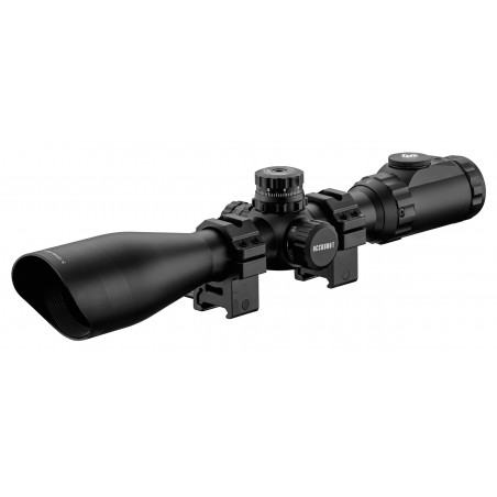 3 tourelles de réglages : dérive, élévation et mise au point. Réticule Mildot illuminé 36 couleurs Livrée avec montage 21 mm type Picatinny, 2 bonnettes rabattables, 2 clefs 6 pans, 1 chiffon optique et 2 piles CR2032.