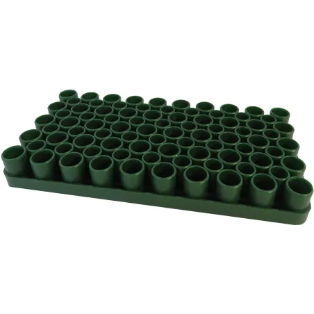 Plateau réversible et multicalibres pour placer les munitions en cours de rechargement 50 tubes diamètre 14 mm et hauteur 23 mm pour les munitions armes longues 36 tubes diamètre 11 mm et hauteur 13 mm pour les munitions armes de poing Dimensions : L 21,7cm x l 10,8cm x h 2,8cm