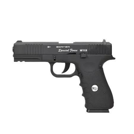 Le pistolet Borner W119 est alimenté par des cartouches de gaz de 12 grammes, a un canon lisse, ce qui permet d'utiliser uniquement des billes de 4,5 mm comme projectiles. Calibre 4,5 mm (.177) Capacité du chargeur 16 Canon lisse Fonction Blowback, qui rend le tir réaliste