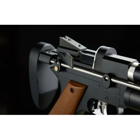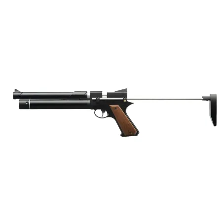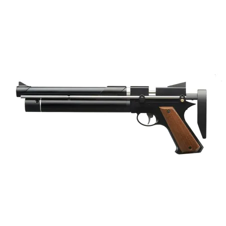 Pistolet à air comprimé PCP Crosse télescopique avec réglage du sabot en hauteur pour plus de confort de tir Détente ajustable avec sureté manuelle Organes de visee inclus et possède un rail sur le boitier pour fixer un point rouge Calibre : 4.5 Capacité : 9 coups Energie : 18 joules Longueur (mm) : 406 sans la crosse Hauteur (mm) : 157 Epaisseur (mm) :32 Poids : 1,47Kg