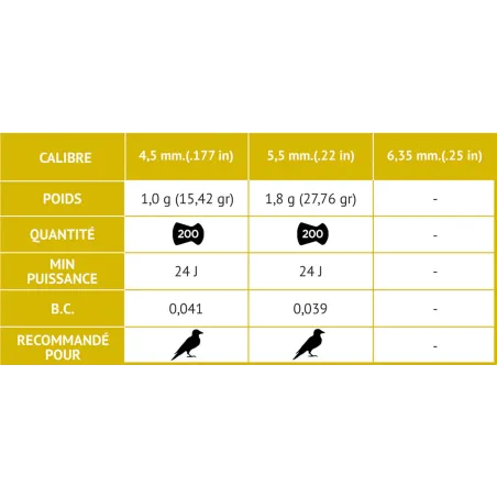Calibre : 4,5 mm (.177). Poids : 1 g. Conditionnement : 200 pièces.