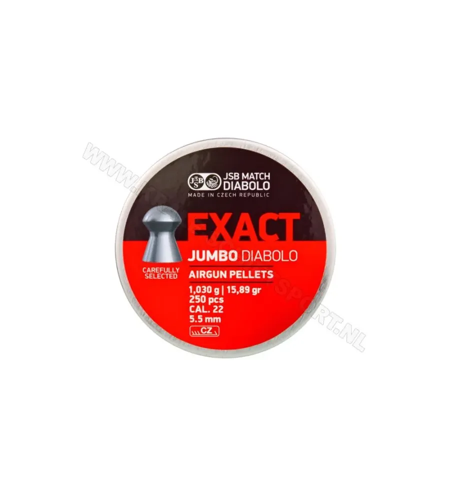 Les plombs JSB Exact Diabolo Jumbo 5.5 mm sont des munitions de haute qualit pour carabines air comprim. Grce leur poids optimis, leur forme spcialement conue et une distribution parfaite de la gravit, ces plombs reprsentent le meilleur choix pour le tir longue distance.