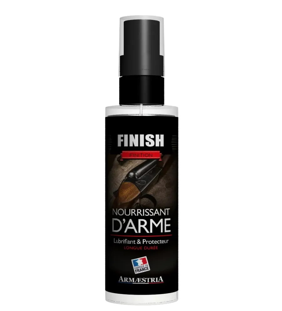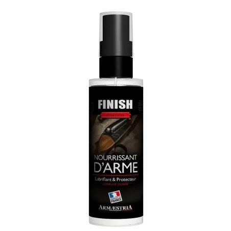 FINISH: Nourrissant / Lubrifiant / Protecteur pour armesFINISH nourrit, protge durablement de toutes les projections et de l'humidit (traces de boues, de graisses, de plomb, de gouttes d'eau...) et redonne l'clat du neuf. Il permet d'obtenir un brillant naturel et une rsistance accrue l'usure grce son film protecteur.Il s'utilise pour fixer et raliser la finition parfaite du bronzage froid BLACK METAL, mais galement pour prserver vos armes, notamment lors d'un stockage prolong ou hivrenal.Prt l'emploi, longue dure.